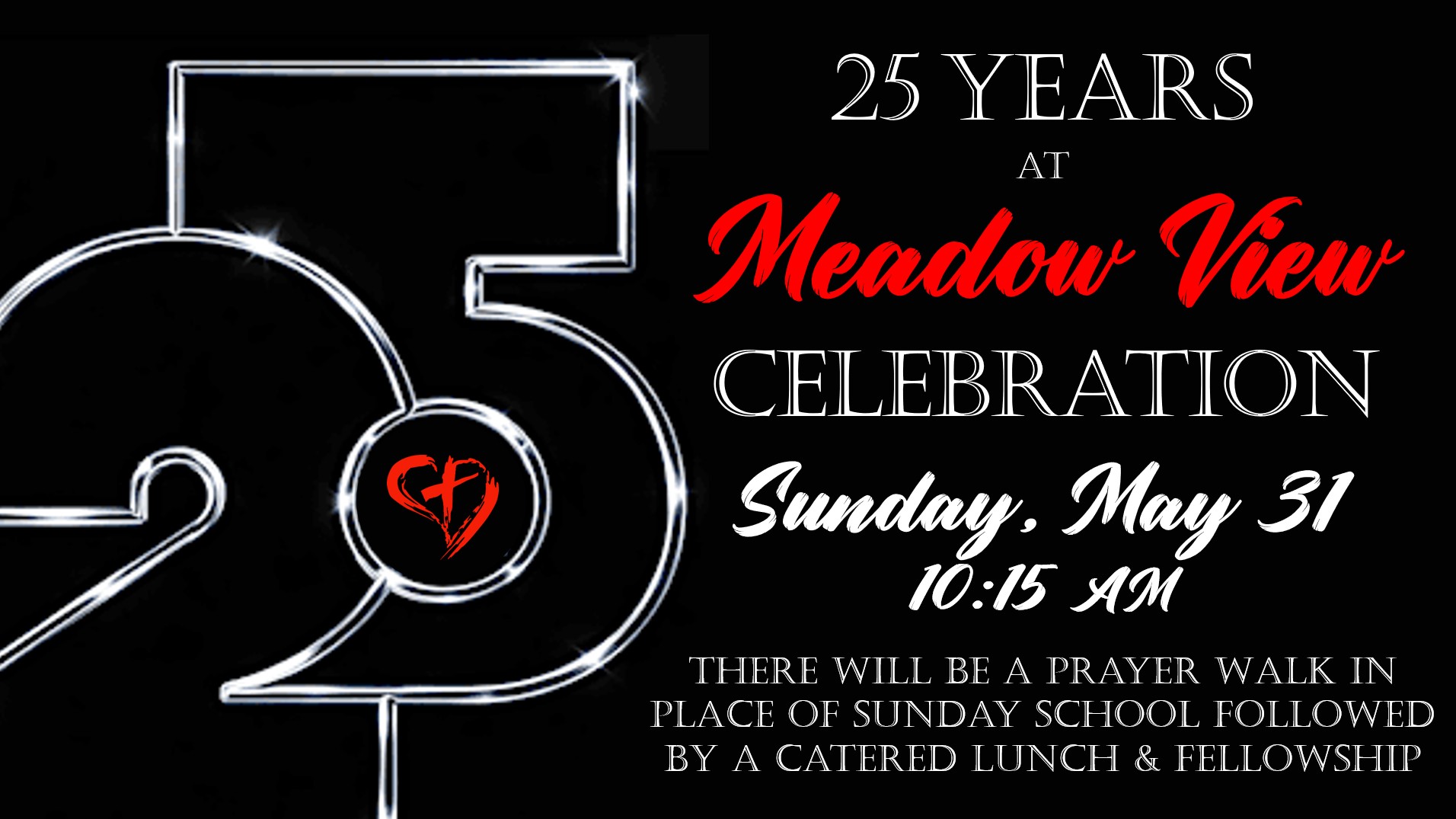 Everyone is invited to join in the celebration of 25 years at Meadow View on Sunday, May 31st! After we worship together, there will be a Prayer Walk in place of Sunday School followed by a catered lunch & Fellowship.
