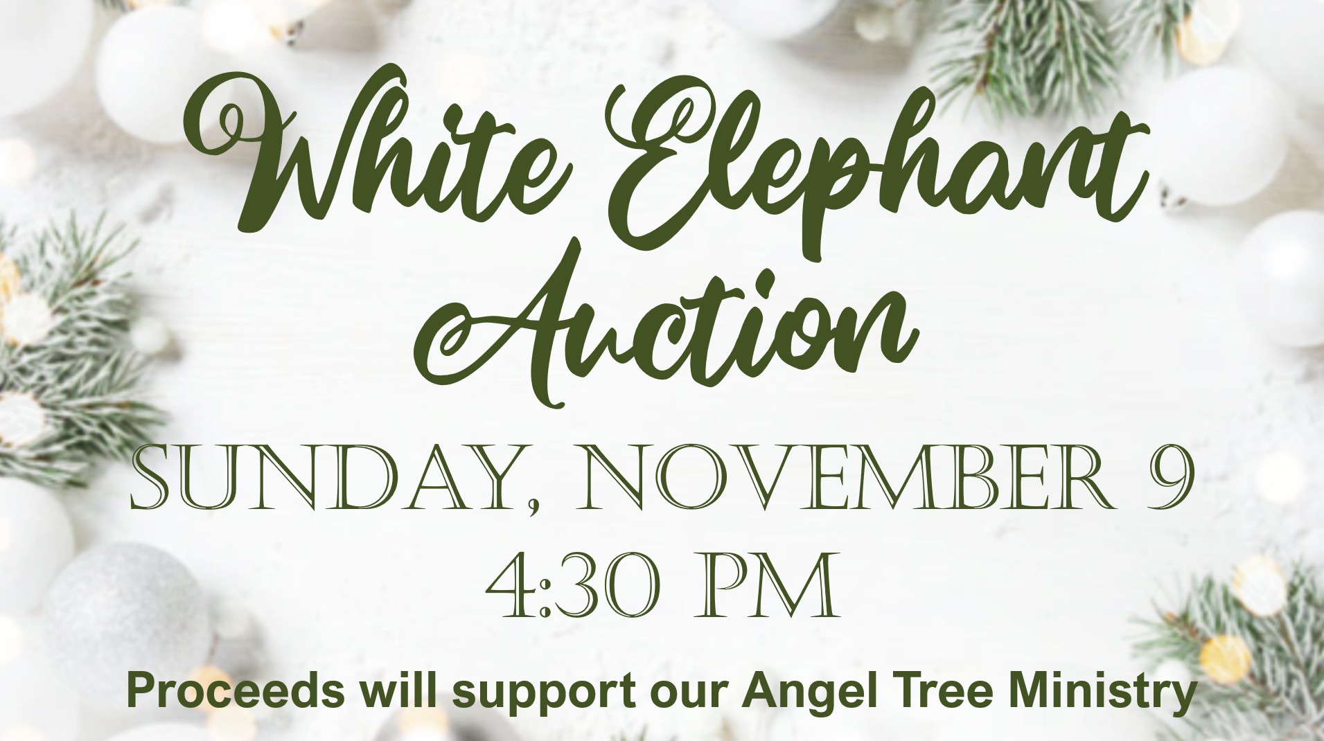 Join us on Sunday, November 9th at 4:30 PM for our annual White Elephant Auction. This fun event will leave you laughing as we raise money to support our Angel Tree Ministry.