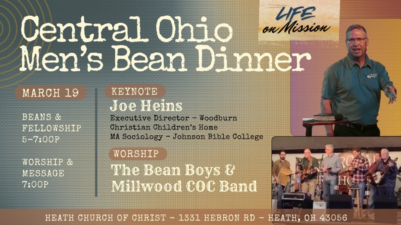 Our men will be traveling to the Heath Church of Christ on Thursday, March 19th for their annual Bean Dinner. Dinner will be from 5:00-7:00 PM with the program starting at 7:00 PM. We have again been asked to provide 10 pies for the dinner; signup at the Welcome Center if you would be willing to.